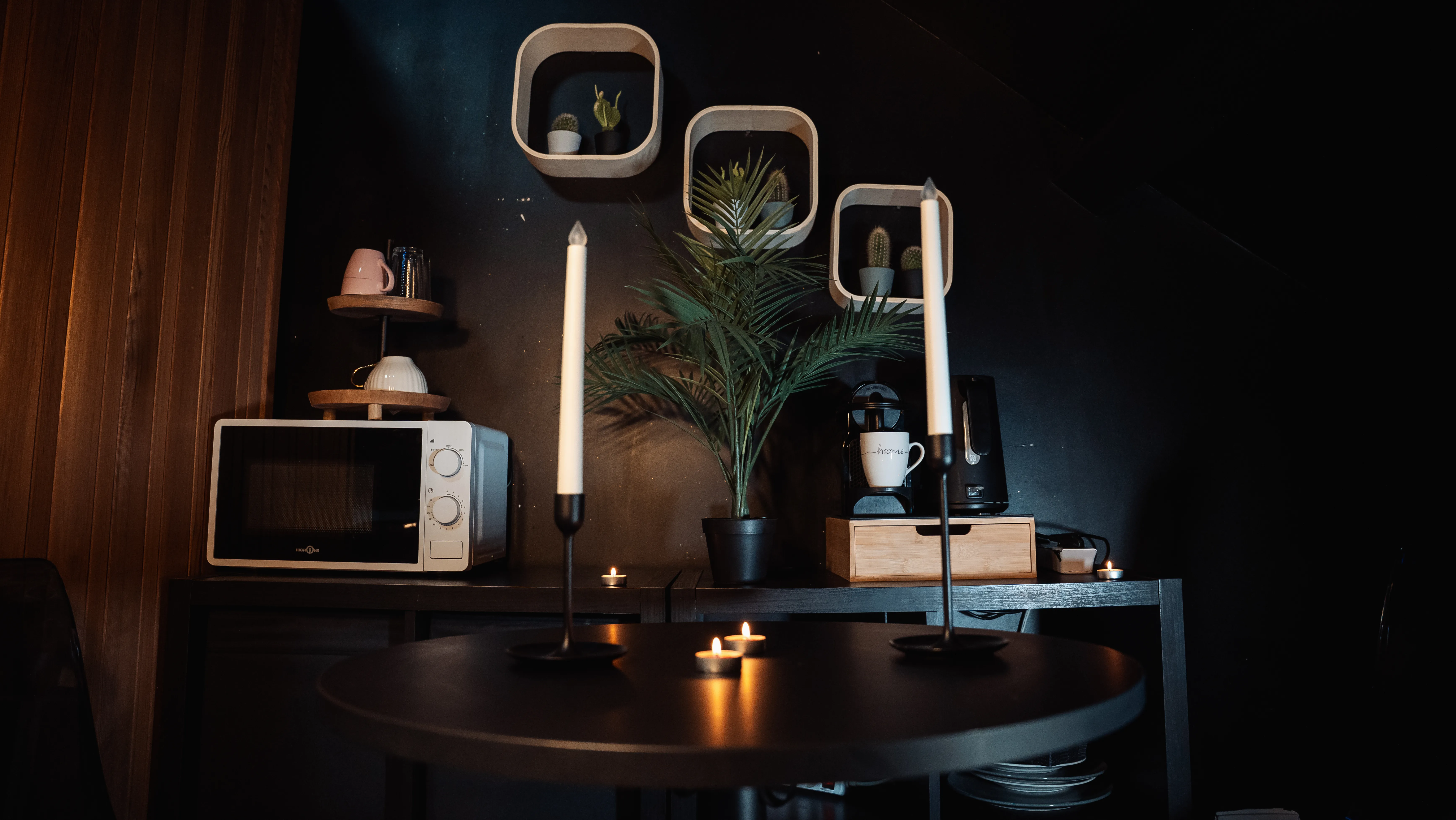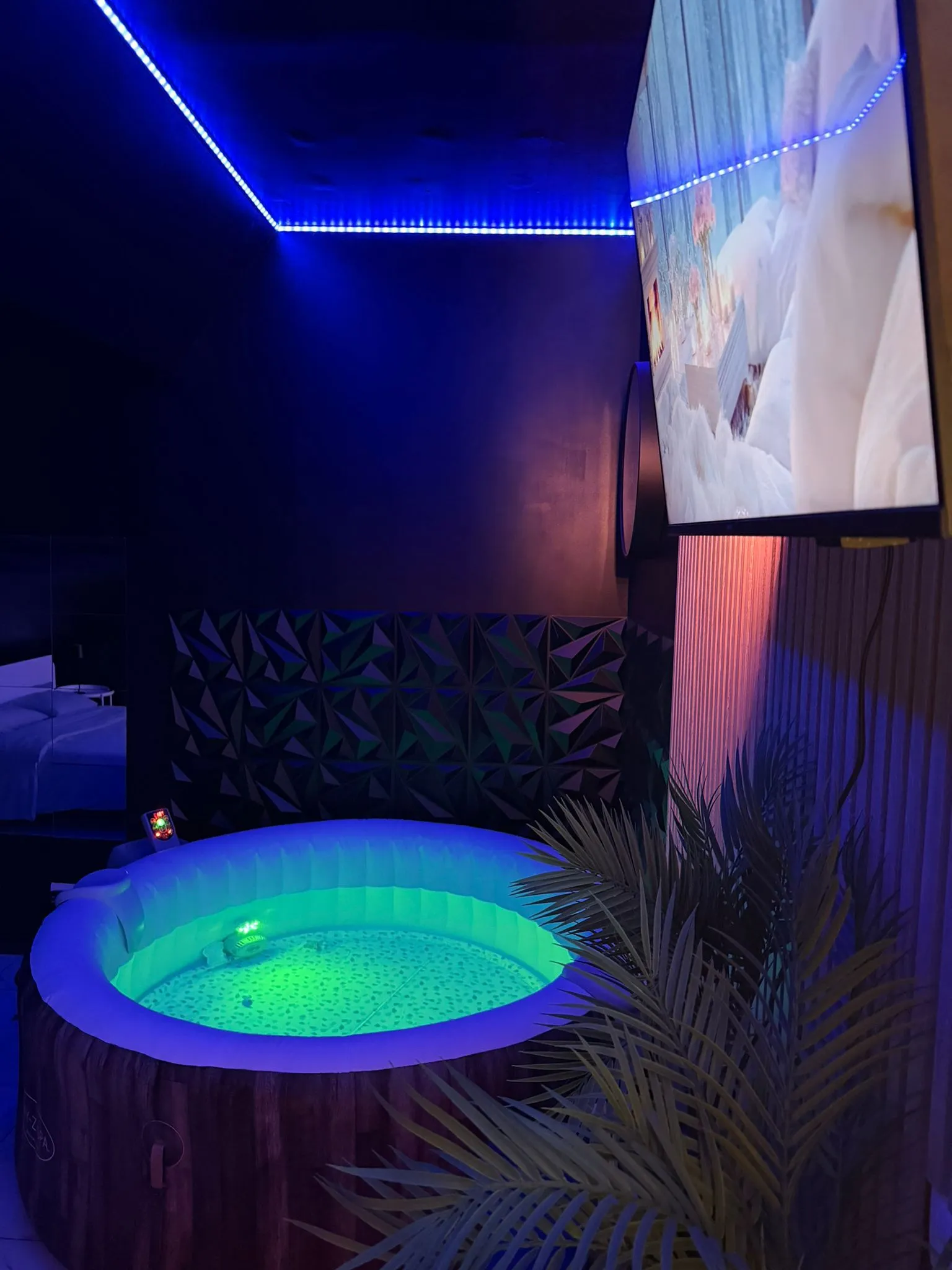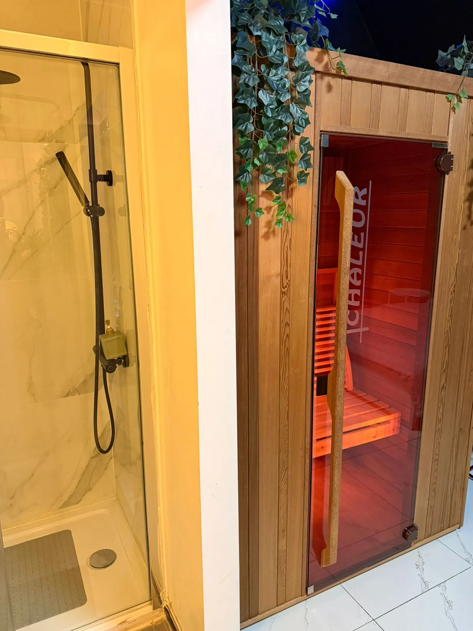 Un espace salon cosy avec canapé moelleux, table basse design et frigo bar rempli de rafraîchissements premium (eaux minérales, jus bio, bières locales). Parfait pour un apéro romantique, une soirée cinéma (écran plat + Netflix) ou un moment chill après le jacuzzi.