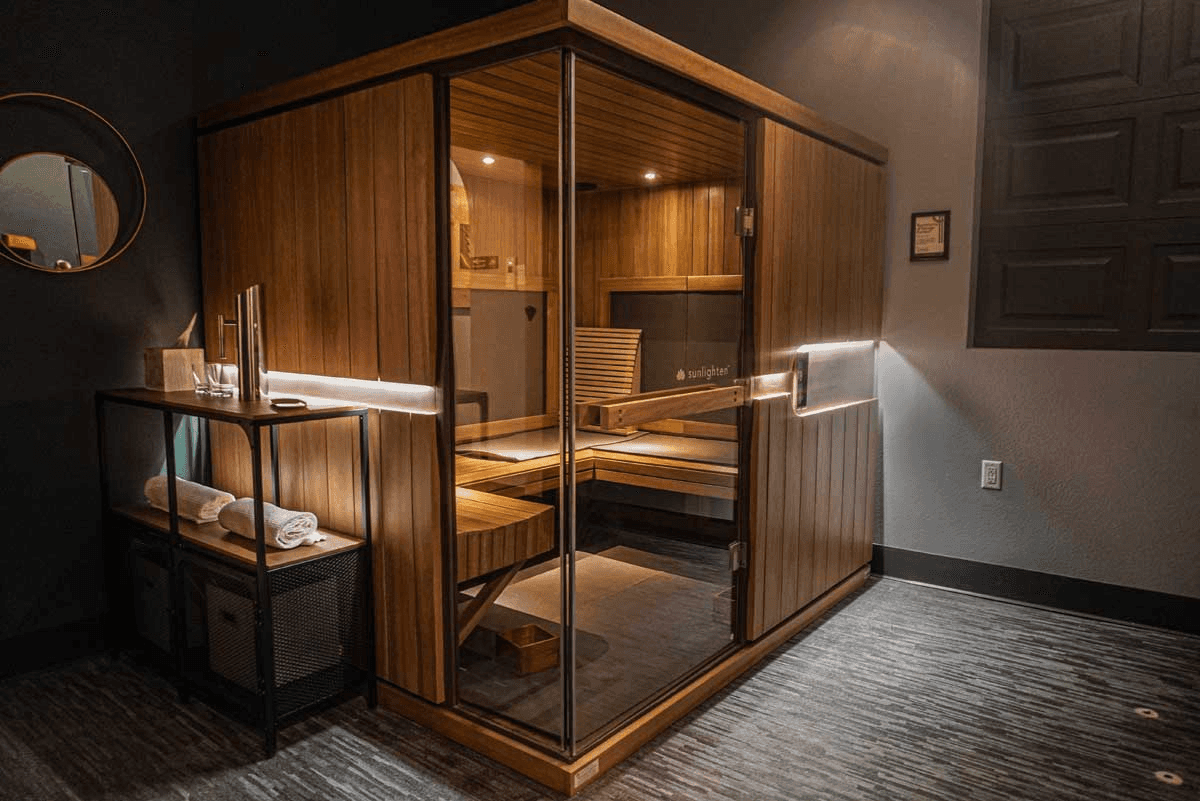 Un sauna en bois ébène aux lignes épurées, conçu pour :